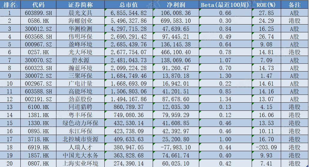 中国主要企业有晨光文具[603899.SH]、海螺创业[0586.HK]、华测检测[300012.SZ]、伟明环保[603568.SH]、盈峰环境[000967.SZ]、光大环境[0257.HK]、碧水源[300070.SZ]、瀚蓝环境[600323.SH]、三聚环保[300072.SZ]、广电计量[002967.SZ]、高能环境[603588.SH]、劲嘉股份[002191.SZ]、同道猎聘[6100.HK]、粤丰环保[1381.HK]、绿色动力环保[1330.HK]、东江环保[0895.HK]、北控城市资源[3718.HK]、人瑞人才[6919.HK]、中国光大水务[1857.HK]、上海实业环境[0807.HK]等。