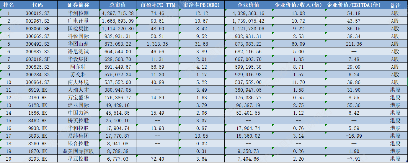 表 中国上市商业服务公司估值对比