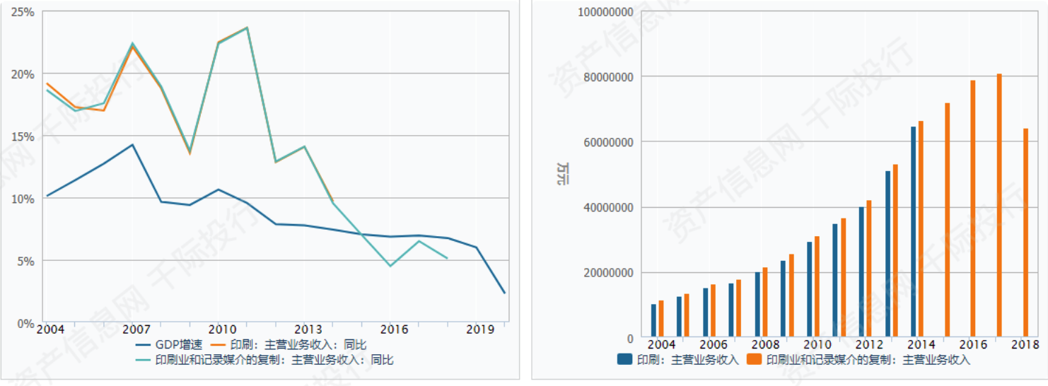 商务服务业在GDP中的比重整体呈上涨趋势,在2019年有所下滑。而印刷行业的产值增长率在2016年起低于GDP增长率,产值在2017年起呈下降趋势。