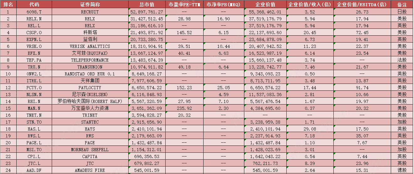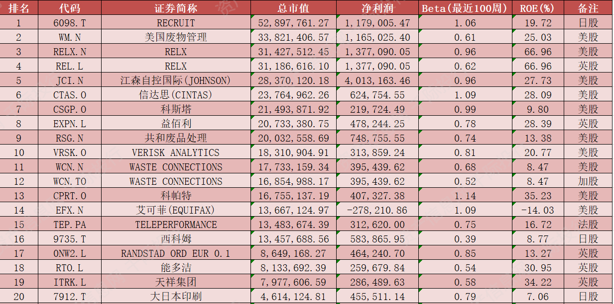 全球非中国主要企业有RECRUIT[6098.T]、美国废物管理[WM.N]、RELX[RELX.N]、RELX[REL.L]、江森自控国际(JOHNSON)[JCI.N]、信达思(CINTAS)[CTAS.O]、科斯塔[CSGP.O]、益佰利[EXPN.L]、共和废品处理[RSG.N]、VERISK ANALYTICS[VRSK.O]、WASTE CONNECTIONS[WCN.N]、WASTE CONNECTIONS[WCN.TO]、科帕特[CPRT.O]、艾可菲(EQUIFAX)[EFX.N]、TELEPERFORMANCE[TEP.PA]、西科姆[9735.T]、RANDSTAD ORD EUR 0.1[0NW2.L]、能多洁[RTO.L]、天祥集团[ITRK.L]、大日本印刷[7912.T]、TOMRA SYSTEMS ORD SHS[0KV7.L]、凸版印刷[7911.T]、SECURITAS[0IAH.L]、RITCHIE BROS AUCTIONEERS[RBA.TO]、HOMESERVE[HSV.L]、G4S[GFS.L]、STANTEC[STN.TO]、HAYS[HAS.L]、MORNEAU SHEPELL[MSI.TO]、BILFINGER[GBF.DF]、TRANSCONTINENTAL INC-CL A[TCL_A.TO]、CEWE STIFTUNG[CWC.DF]、AMADEUS FIRE[AAD.DF]、ALBA[ABA.DF]、BERTRANDT[BDT.DF]、FRANCOTYP-POSTALIA HOLDING[FPH.DF]、11880 SOLUTIONS[TGT.DF]、TURBON[TUR.DF]、READCREST CAPITAL[EXJ.DF]、NESCHEN[NSN.DF]等。