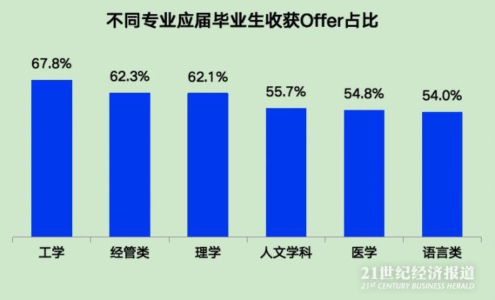 21世纪经济报道记者注意到,在毕业生专业方面,工学毕业生收获Offer占比最高,达67.8%,其次是经管类(62.3%)。智联招聘分析人士表示,工科生的专业背景与就业期望更侧重技术、研发等人才需求大的核心岗位,落实就业较其他专业更轻松。相反,语言类专业收获Offer的占比为54%,在整体专业中垫底。