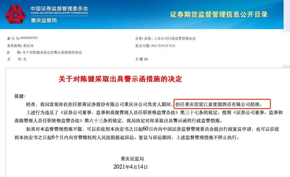 重庆证监局称,发现浙商证券重庆分公司负责人陈健、申万宏源证券重庆分公司负责人王军在任职期间存在兼职的行为,反映两家券商内部控制不完善、合规管理不到位,因此对两家券商及前述人员采取出具警示函措施。