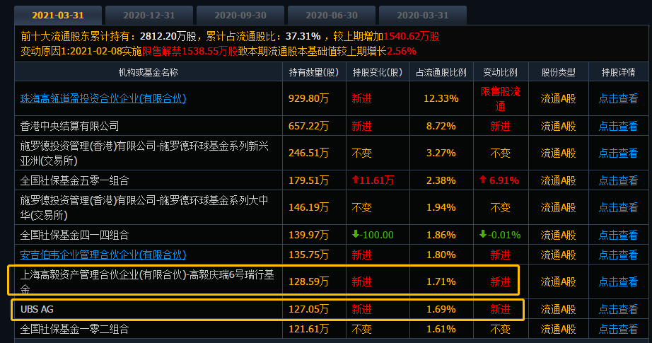 同时,UBS AG新进为第9大股东,持股数量为127.05万股,持股比例为1.69%。UBS AG是国外知名机构瑞银集团。