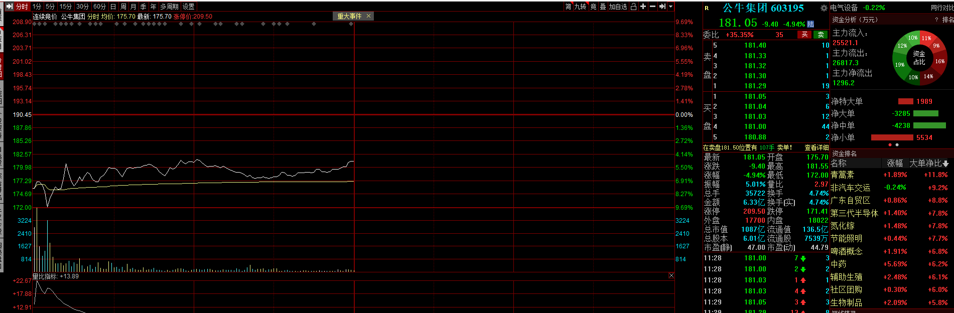 同花顺(300033)数据显示,公牛集团开盘后迅速下挫,盘中最高跌幅超过9%。截至发稿,公牛集团跌幅收窄为4.94%,股价为181.05元,市值为1087亿元。