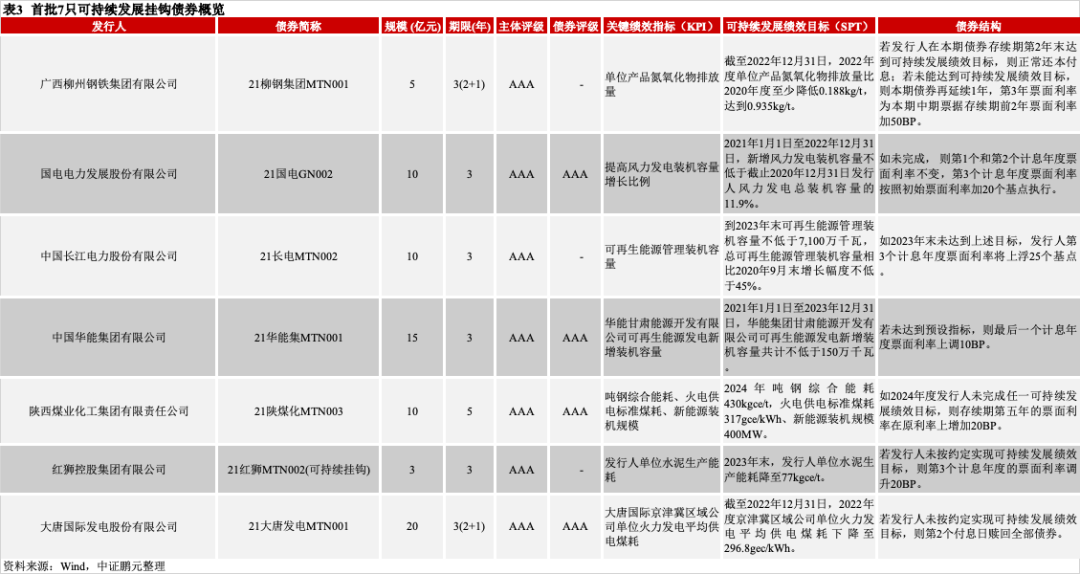 银行间债券市场首批有7家企业发行了可持续发展挂钩债券,募集资金规模73亿元,具体情况见表3。从发行人来看,有电力、钢铁、煤化工、水泥生产企业;发行人主体信用级别均为AAA级;可持续发展挂钩债券的发行期限以3年为主;挂钩的关键绩效指标有新能源发电装机容量、单位产品能耗和污染物排放量,挂钩的债券结构设计有续期、利率调升、赎回。
