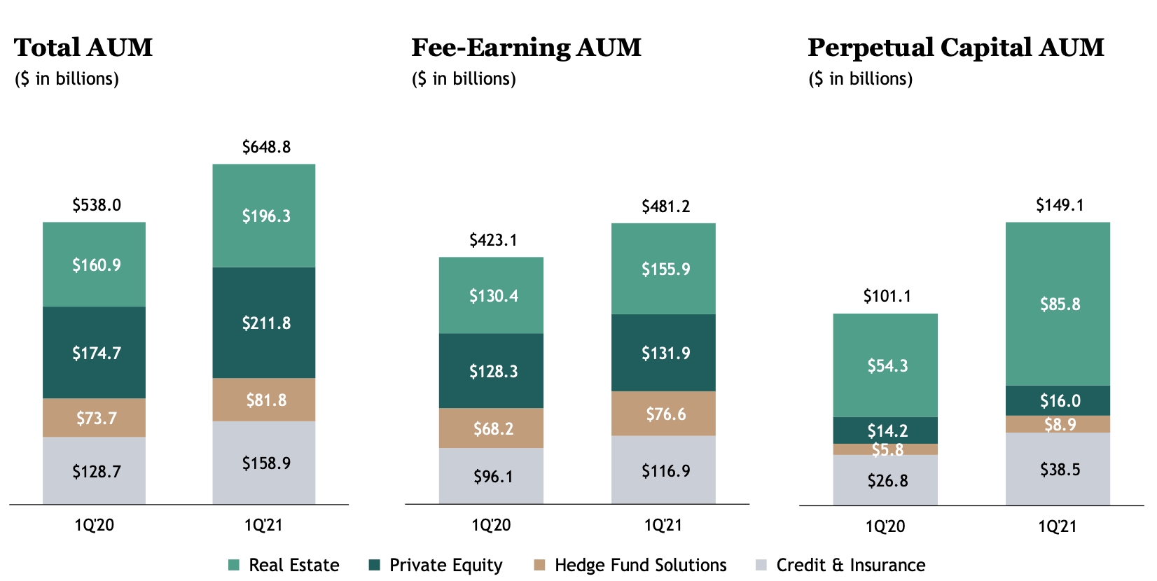 作为一家另类资产管理公司,黑石集团的主要业务板块包括房地产、私募股权、对冲基金和信贷。根据财报数据,截至2021年3月31日,黑石集团私募股权业务的AUM为2118亿美元,较上季度末的1975亿美元增加7.2%,较去年同期的1747亿美元增加21.2%。