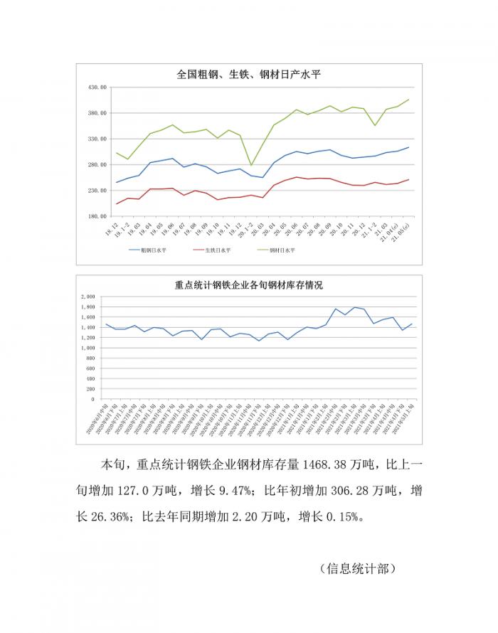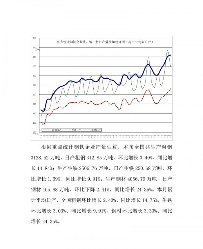 本旬平均日产,粗钢241.78万吨,环比增长0. 75%、同比增长17. 84%;生铁20614万吨,环比增长2.06%、同比增长11. 50%;钢材229. 22万吨,环比下降7.10%、同比增长19. 81%。