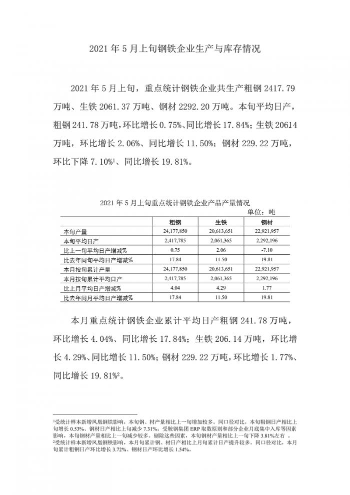 5月13日,中钢协数据显示,5月上旬,重点统计钢铁企业共生产粗钢2417. 79万吨、生铁2061. 37万吨、钢材2292. 20万吨。