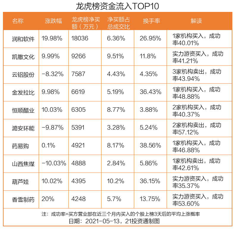 5月13日,上证指数下跌0.96%,深证成指下跌1.05%,创业板指下跌0.57%。盘后龙虎榜数据显示,共有41只个股因当日异动登上龙虎榜,资金净流入最多的是润和软件(300339.SZ),达1.8亿元。