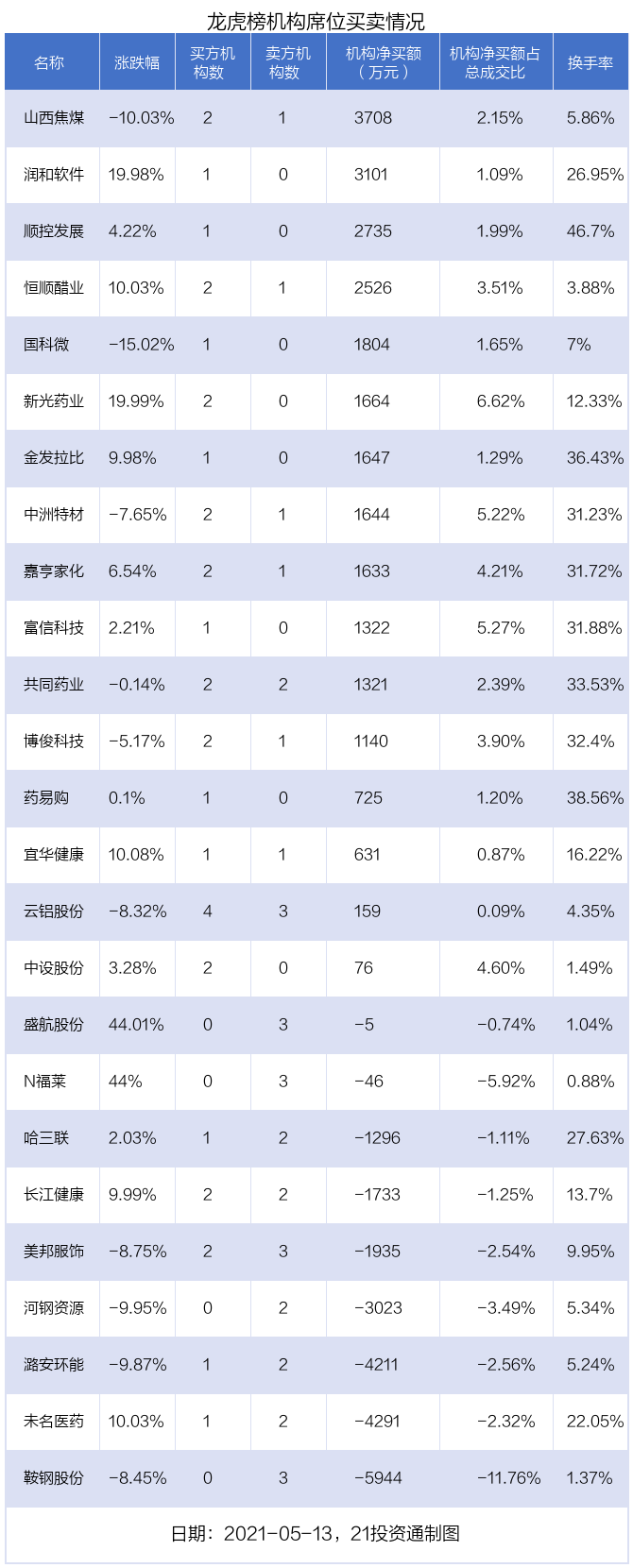 5月13日,25只个股龙虎榜出现了机构的身影,机构合计净买入3350.25万元。具体来看,机构净买入16股,净卖出9股。