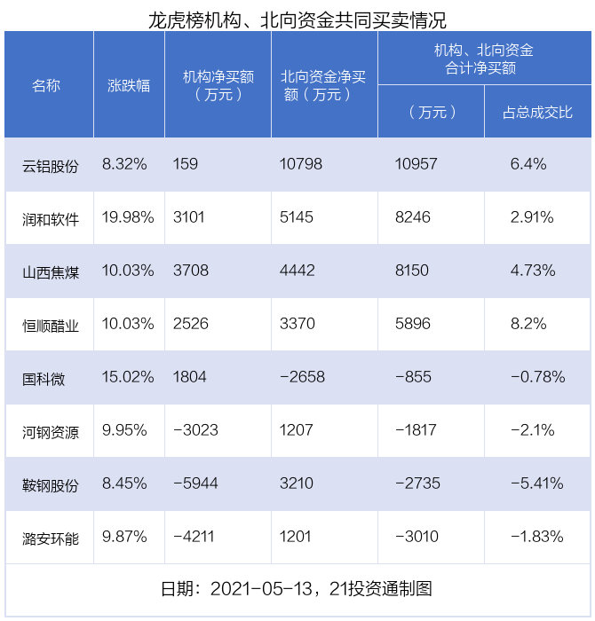 值得注意的是,机构和北向资金共同净买入了云铝股份、润和软件、山西焦煤、恒顺醋业等4股;在鞍钢股份,河钢资源,潞安环能,国科微上出现分歧,机构净卖出鞍钢股份5944.35万元,北向资金净买入3209.57万元;机构净买入国科微1803.58万元,北向资金净卖出2658.22万元。