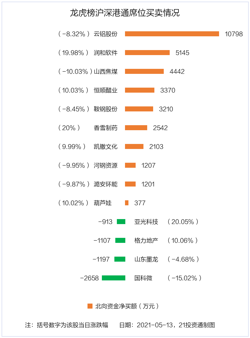 5月13日,北向资金参与龙虎榜中的个股共有14只,合计净买入2.85亿元。其中沪股通净买入3 股,净卖出1 股,合计净买入3840.73万元;深股通净买入7 股,净卖出3 股,合计净买入2.47亿元。