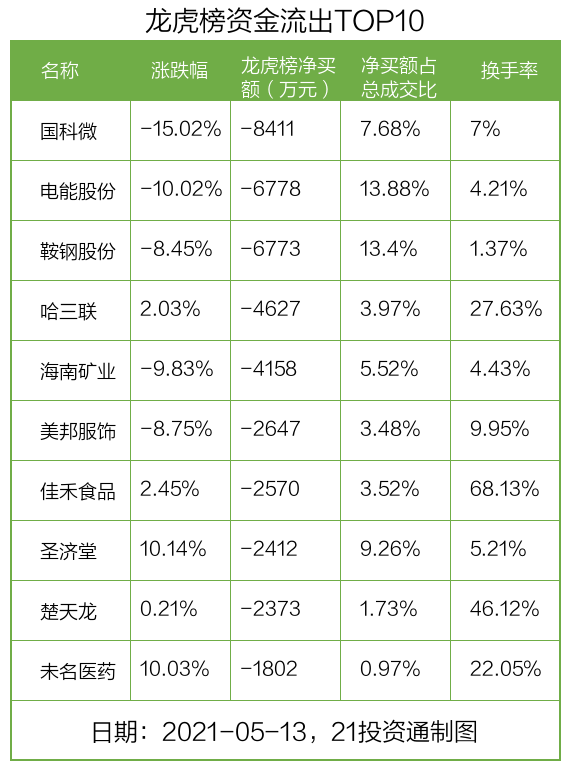 而龙虎榜中资金净流出最多的是国科微(300672.SZ),被净卖出为0.84亿元,占总成交金额的7.68%。国科微收盘下跌15.02%,换手率为7%。