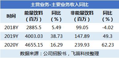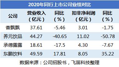 2020年,东鹏饮料的营收和扣非净利润增速跟同行香飘飘(603711.SH)、养元饮品(603156.SH)、承德露露(000848.SZ)相比,均好于同行可比公司。