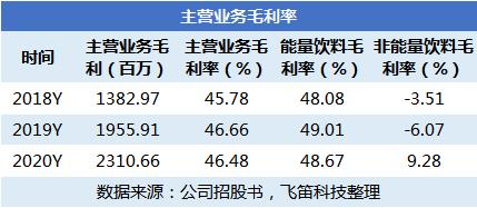 从业务结构的收入情况来看,2020年,能量饮料实现收入46.55亿元,同比增长16.29%,较2019年增速下降。由于这块业务占比较大,其收入波动直接决定了公司的营收波动情况。非能量饮料,这块业务规模较小,但成长性较好,处于市场开拓阶段。2020年,非能量饮料实现收入2.4亿元,同比增长62.23%,跟往年比增速快。
