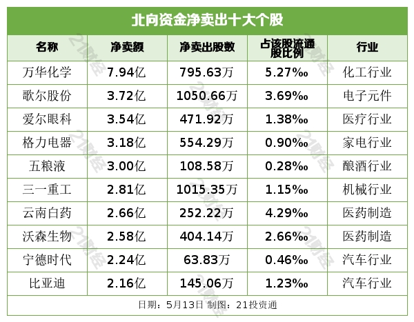 净买入亿纬锂能4.67亿元,净卖出万华化学7.94亿元