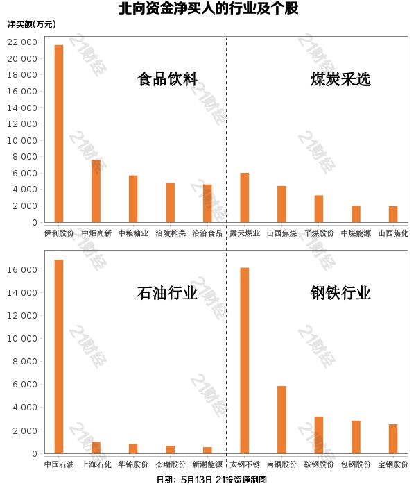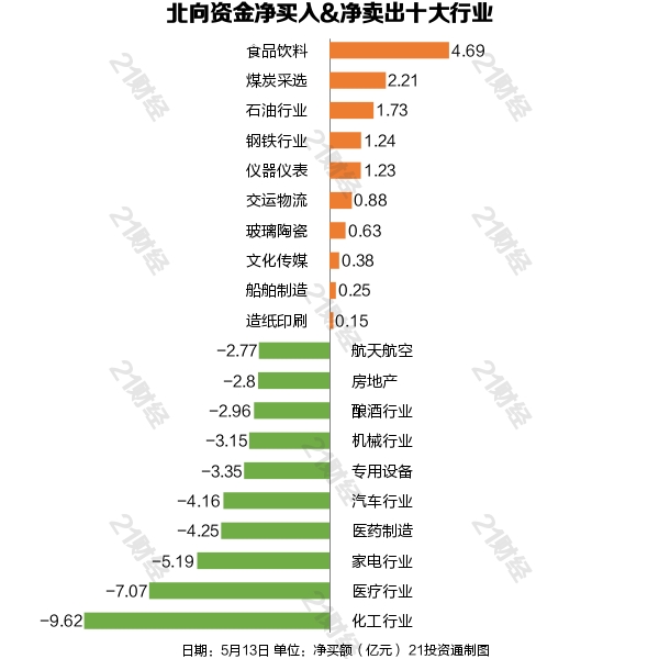 从净买入金额来看,北向资金增持了16个行业,其中食品饮料居首,净买入金额达4.69亿元,其次是煤炭采选行业,净买入2.21亿元。