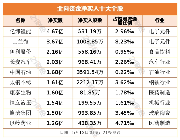 个股方面,北向资金净买入“锂茅”亿纬锂能(300014.SZ)、士兰微(600460.SH)、伊利股份(600887.SH)、长安汽车(000625.SZ)、中国石油(601857.SH)居前,其中,亿纬锂能被净买入4.67亿元,士兰微被净买入3.67亿元,伊利股份被净买入2.16亿元,长安汽车被净买入2.03亿元,中国石油被净买入1.68亿元。