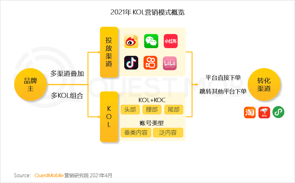 据QuestMobile的调查,KOL既是媒介渠道,同时也是销售渠道,兼顾多平台,多KOL布局是品牌主投放的首选。除了抖音、快手、微信之外,微博也是投放的重要渠道。