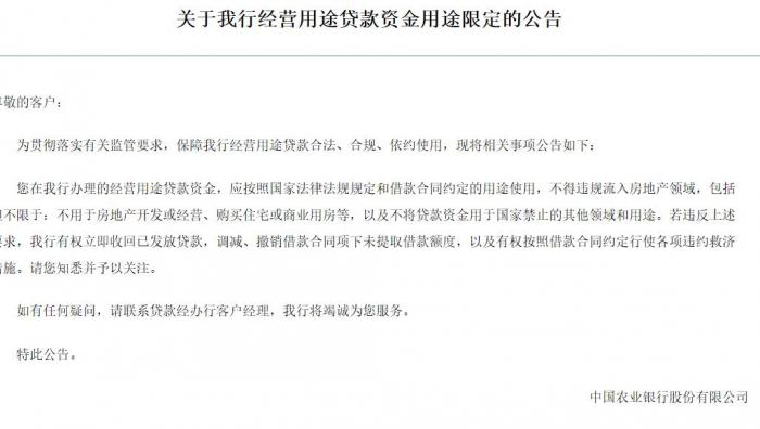 农业银行:经营用途贷款资金不得违规流入房地产领域