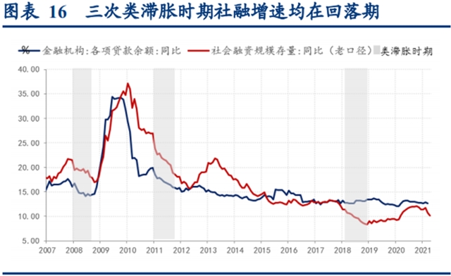 华创证券研究发现:类滞胀背景下,都呈现了紧信用的大环境。类滞胀时期,经济增长速度放缓的同时,实体融资需求亦开始回落,并且同期监管政策多进行信用结构治理。多因素作用下,信用扩张速度在这一时期触顶下行。甚至信用周期的收缩最后往往引发尾部企业的出清。