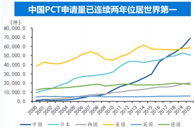 中国PCT(专利合作条约)申请量在2008年以后快速增加,自2019年起位居世界第一。