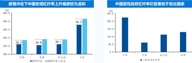 本轮的疫情冲击导致各国宏观杠杆率上升,但中国整体上升幅度较为温和,绝对水平低于美、欧、日等国家和地区;中国政府部门杠杆率仍显著低于发达国家,政策腾挪空间大。