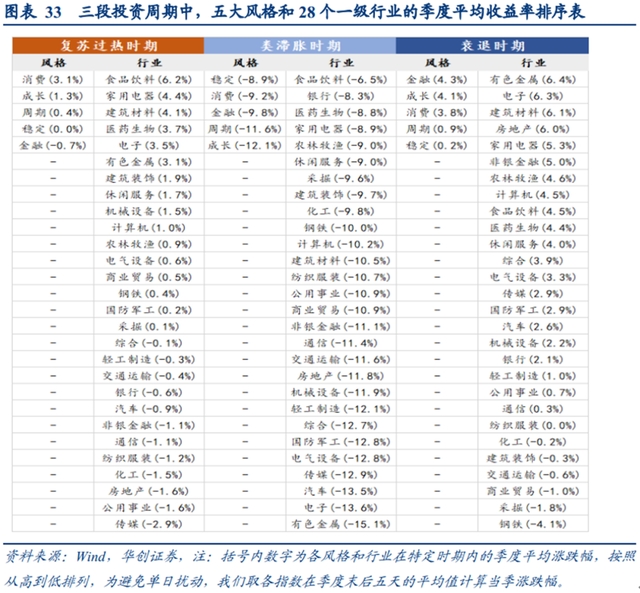 华创证券认为在“类滞胀”环境下,找到估值提升行业的概率很低。华创证券通过对行业配置的风格和行业的复盘,制作了在三个投资周期中,5大风格指数与28个申万一级行业的季度走势复盘。在类滞胀时期,表现相对较好的风格和股票“稳定、消费和金融类股票”,“食品饮料、银行和医药生物行业”。