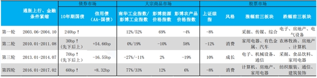国泰君安通过对“通胀上行、金融条件收缩”的时间段来观察股票市场的表现。总体上来看,除了第三轮期间受货币政策宽松影响外,其它几轮都因金融条件收紧而出现压力。风格上都向“消费和低估值”的周期转化。