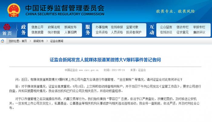 问:近日,有媒体报道某微博大V爆料某上市公司与盘方合谋进行市值管理、“坐庄赖账”等情况,请问证监会对此有何评论?