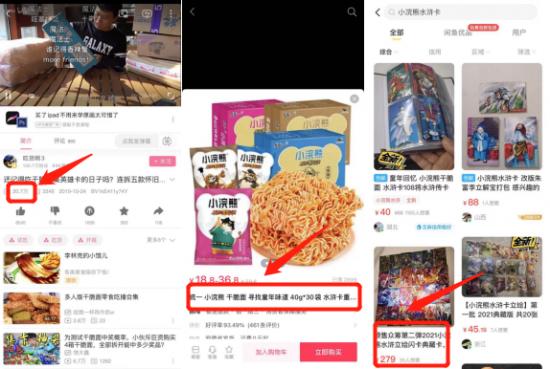 B站上,有UP主为了找回和集卡相关的回忆,专门录了干脆面的开箱视频,播放量高达20多万;抖音上,靠着“童年情怀”,统一干脆面出现在了各大主播的带货“小黄车”里;闲鱼上,小浣熊干脆面的水浒系列典藏卡,能卖出近300元的高价,想要的人还不少。