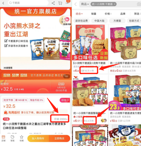 其二,下沉市场对性价比高的“走量”商品接受度更高。“琥珀消研社”对比了统一干脆面在淘宝和拼多多两个平台的销量,发现其在拼多多上的销量要远高于淘宝。
