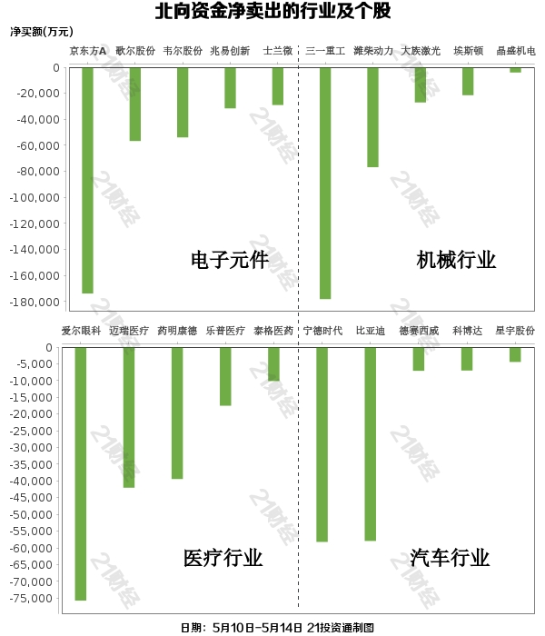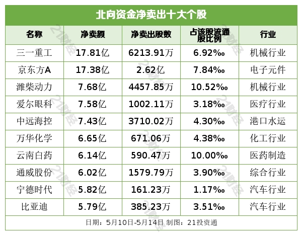 其中,三一重工被净卖出17.81亿元,京东方A被净卖出17.38亿元,潍柴动力被净卖出7.68亿元,爱尔眼科被净卖出7.58亿元,中远海控被净卖出7.43亿元。