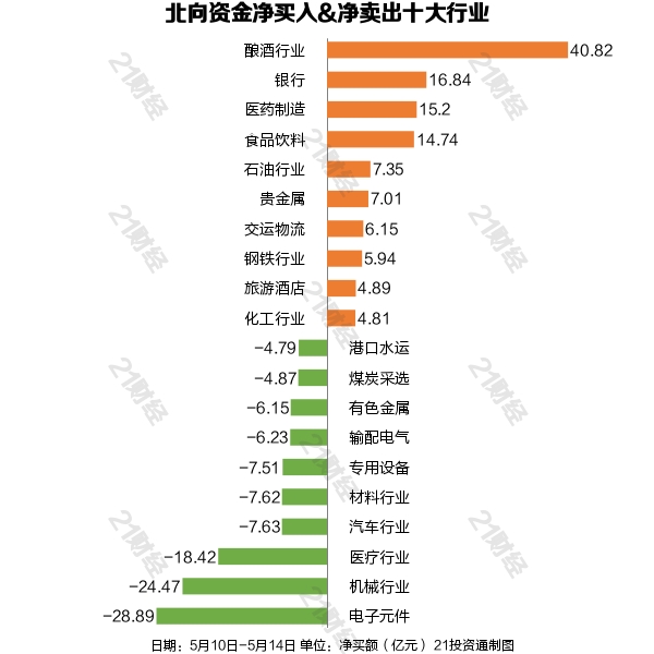 从净买入金额来看,据21投资通(微信号ID:touzit21)智能监测,本周北向资金增持了36个行业,增持净额超过10亿元的行业共有5个,分别是酿酒、钢铁、银行、贵金属和石油行业。
