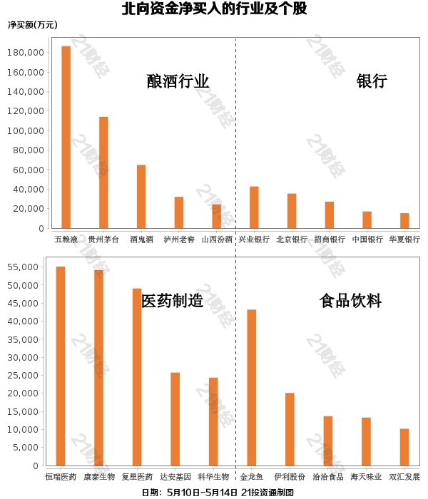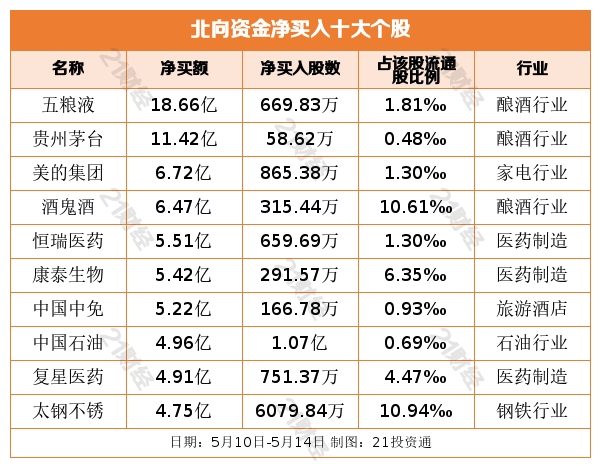 个股方面,北向资金抢筹白酒龙头股。五粮液(000858.SZ获净买入18.56亿元,位居净买入榜榜首,其股价本周探底回升涨5.48%;贵州茅台(600519.SH)获得逾11.44亿元净买入,截至5月14日收盘,股价重新站上2000元;酒鬼酒(000799.SZ)亦获得5.59亿元的净买入,股价大涨16.71%,逼近历史最高点。