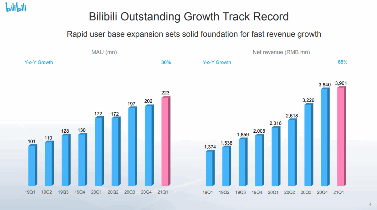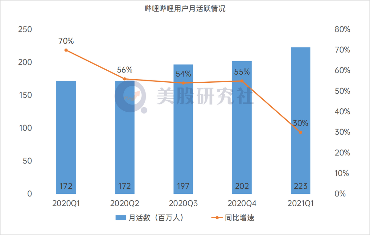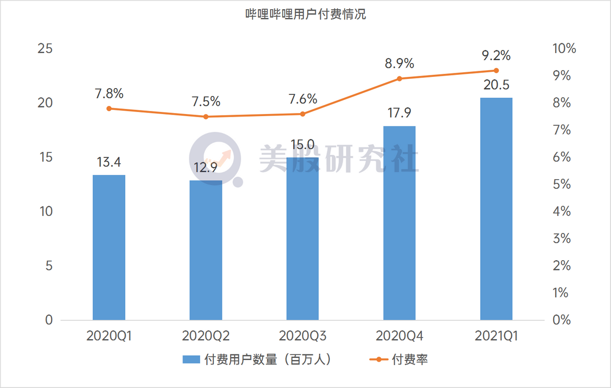5月13日美股盘前,B站公布了赴港二次上市以来的第一份财报,其中核心数据均实现了超出预期的增长,财报显示,截至2021年3月31日的第一季度,B站实现营收39亿元人民币,略高于彭博分析师一致预期的37.8亿元,同比增长68%;月活用户(MAU)2.233亿,同比增长30%;每月平均付费用户(MPU)2050万,同比增长53%,整体付费率提升至创纪录的9.2%。