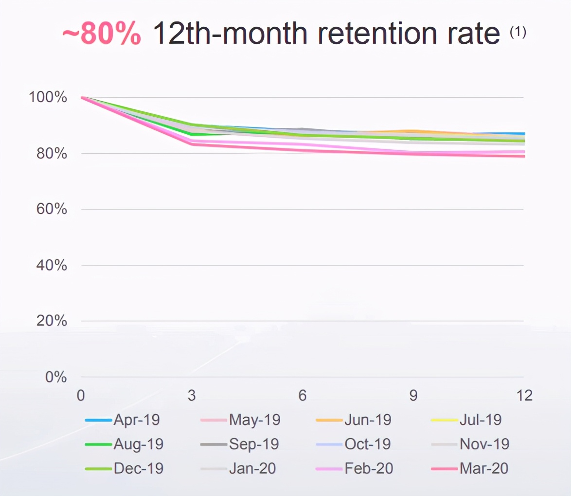 从财报数据来看,B站总体营收增长稳定,且用户数据表现突出。B站用户增长超过预期水平,本季度B站月活用户达到2.233亿,同比增长30%,日活用户达6010万,同比增长18%,B站的运营拉新卓有成效。B站的用户群体展露了极高的用户粘性,Q1季度日均视频播放量达16亿次,同比提升47%;社区月均互动数达66亿次,同比增长35%;日均使用时长增长至82分钟;正式第12个月用户留存率高达80%。