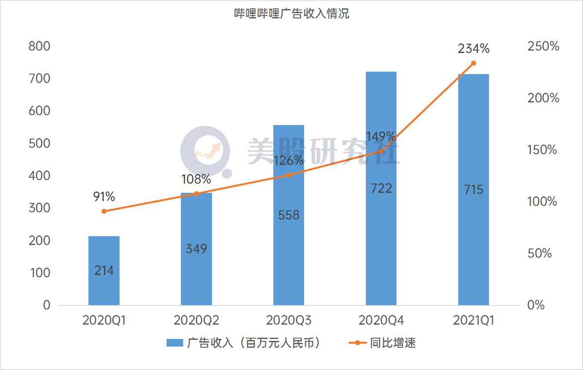 Q1季度广告的表现也让市场看到了全新的增长点,其收入为7.147亿元人民币,较2020年同期同比增长234% 。随着B站破圈力度的加大,用户流量盘实现明显增长,品牌认知度提升,广告业务还将得到进一步扩张,尤其是B站自身重视广告的表达水平,“用户从来不排斥广告”,首席运营官李旎说,“好的广告可以是好的内容,而好的内容也可以是好的广告”。