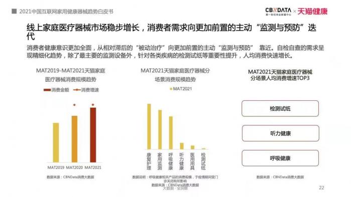2021财年,天猫健康平台器械行业的新锐品牌同比增长了200%,天猫健康正在成为家用健康器械领域新锐品牌的孵化场,新品发售的聚集地。