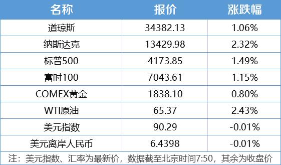 上周五,道指涨1.06%,报34382.13点,周跌1.14%。纳指涨2.32%,报13429.98点,周跌2.34%。标普500指数涨1.49%,报4173.85点,周跌1.39%。