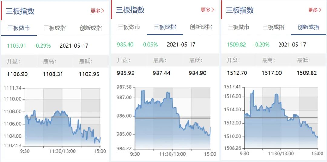 截至5月17日收盘,三板做市报1103.91点,下跌0.29%;三板成指报985.40点,下跌0.05%;三板创新报1509.82点,下跌0.20%。