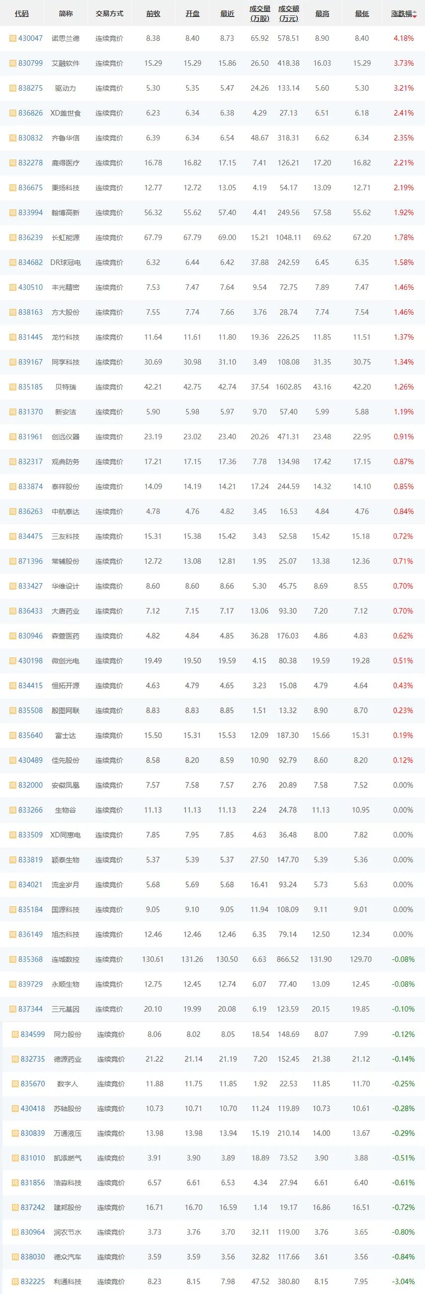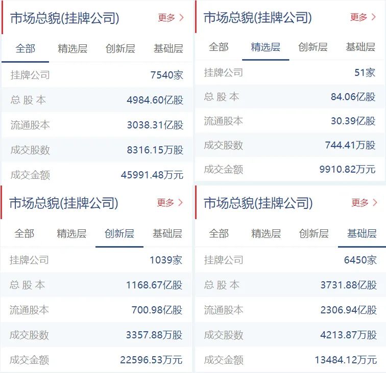 截至5月17日收盘,今日成交金额为4.60亿元,精选层成交金额为0.99亿元,创新层成交金额为2.25亿元,基础层成交金额为1.35亿元;今日成交股数为8316.15万股,精选层成交股数为744.41万股,创新层成交股数为3357.88万股,基础层成交股数为4213.87万股。