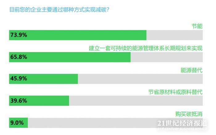 在减碳方式上,近7成企业选择节能,近65%企业选择设立一套可持续的能源体系长期规划,47%企业选择推动能源替代(如煤改电、煤改气,使用风能光能等),只有9%的企业表示将通过使用碳抵消这种被动方式来实现。