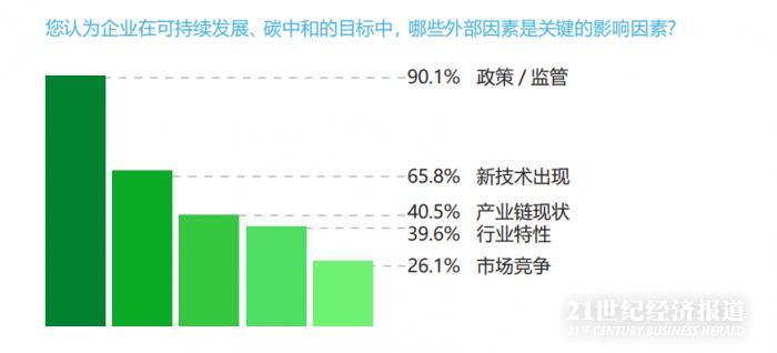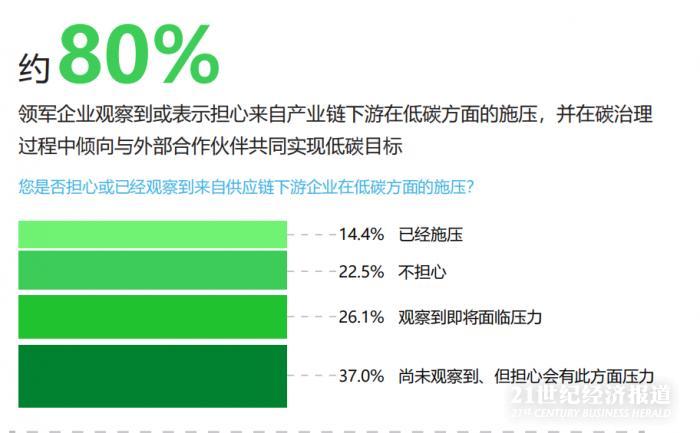 根据该调研报告,中短期有37%的企业表示会承受来自碳中和的压力,有75%的企业担心或者已观察到来自供应链的挑战。