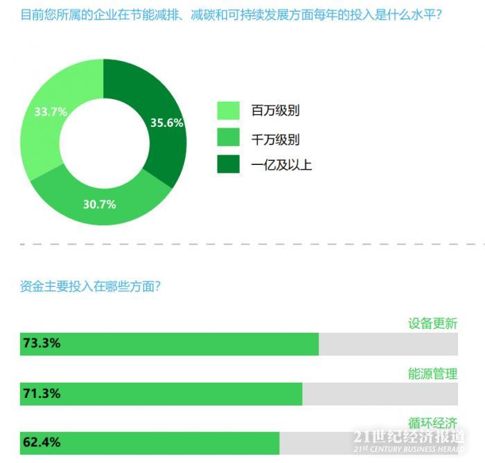 报告显示,在领军企业中,减碳的投资已经产生分级:亿元级、千万级、百万级投入的企业各占约三分之一。