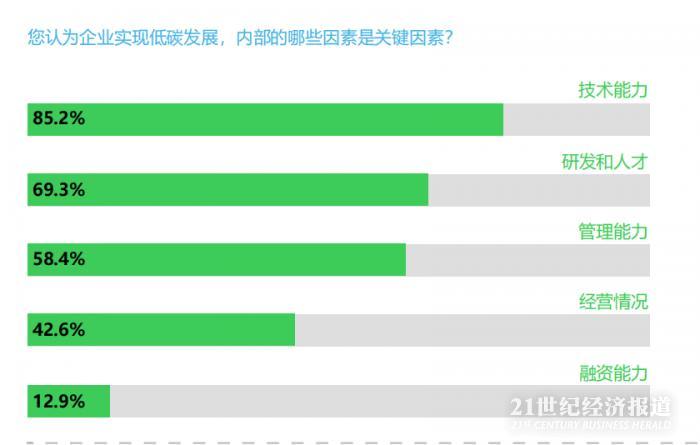 从企业内部因素来看,技术和创新依旧是企业迈向碳中和的关键因素。在具体实践中,被调查企业认为技术能力是首要的,其占比达到85%以上;其次是研发和人才,约占70%。