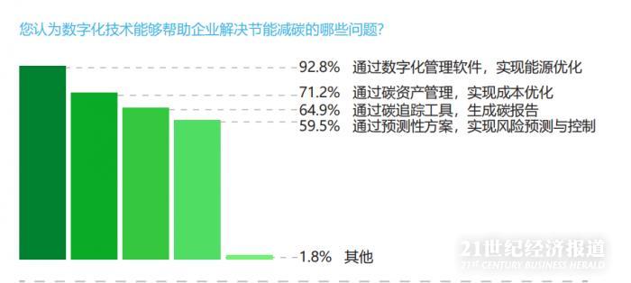 在技术上,94%的企业愿意将数字化用于企业的碳治理,69%的受访者选择通过碳资产管理,实现成本优化;67%的受访者选择通过碳追踪工具,生成碳报告;60 %的受访者选择通过预测性方案,实现投资风险预测与控制。