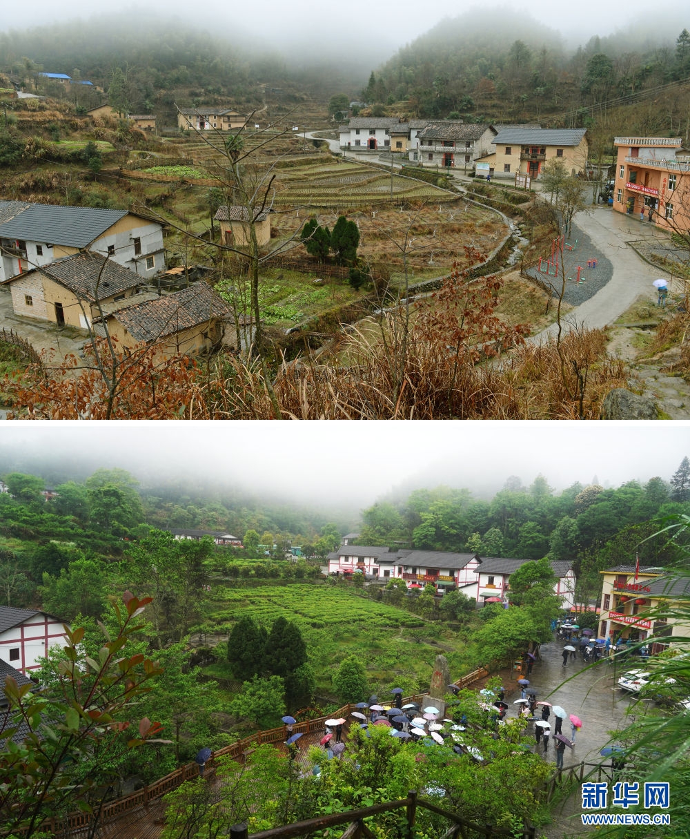 △拼版照片:上图为2016年1月31日拍摄的井冈山市茅坪镇神山村;下图为游客在井冈山市茅坪镇神山村游览参观(2021年4月26日摄)。新华社记者 万象