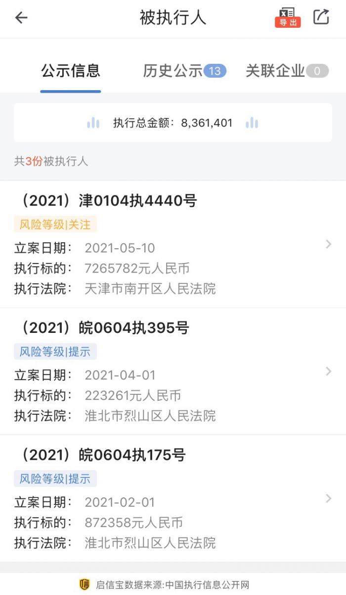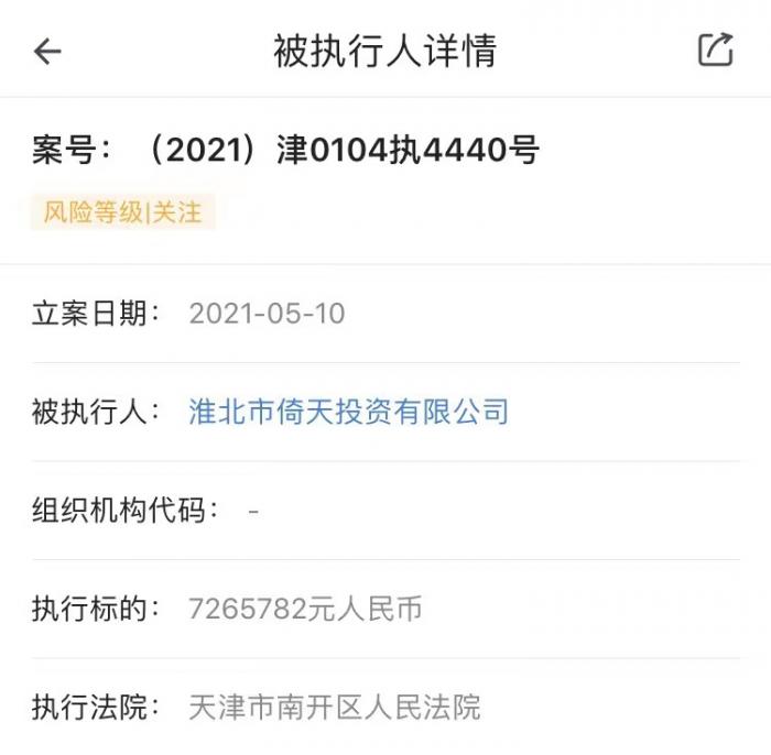 启信宝显示,执行标的7265782元,案号(2021)津0104执4440号,执行法院为天津市南开区人民法院。截至目前,叶飞及其公司被执行数额超836万元 。同时,该公司多次被列为失信被执行人(老赖),涉及多则终本案件及限制消费令。