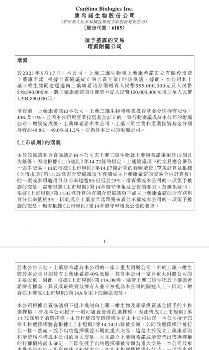 增资前,上药康希诺由康希诺生物、上药三维生物和产业投资基金分别持有45%、40%及15%;增资后,上药康希诺由康希诺生物、上药三维生物和产业投资基金分别持有约49.8%、49.0%及1.2%。